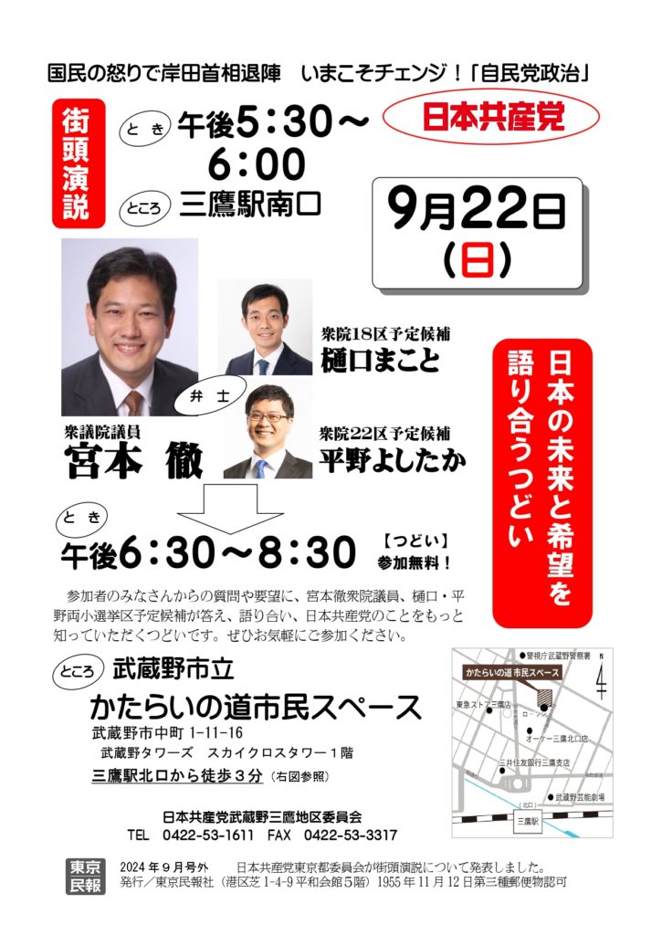 9月22日(日) 街頭演説と日本の未来と希望を語り合うつどいを行います